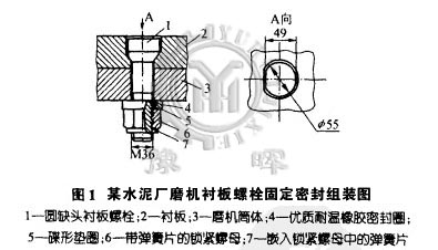 所以水泥廠從國外引進生料磨、水泥球磨機等多種設備投入運轉。其襯板固定螺栓采用了帶彈簧片的鎖緊螺母和碟形墊圈加優(yōu)質耐溫像膠密封圈進行緊固和密密封等新型結構,使用多年來一直很理想,如圖1所示。